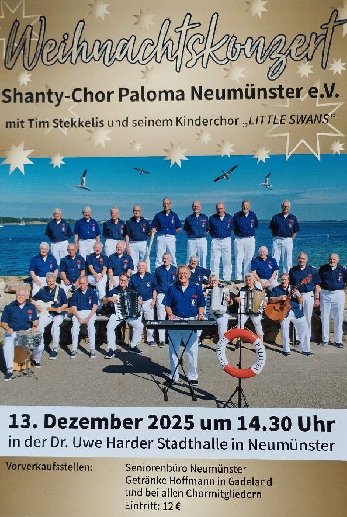 Der Shanty-Chor Paloma Neumünster e.V. wurde im April 2005 gegründet und besteht zur Zeit aus 39 Mitgliedern, davon 30 Sänger, 8 Musiker und dem Chorleiter Hans Georg Wolos.Repertoire